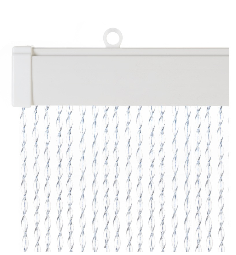 Het vliegengordijn is gemaakt van doorschijnende pvc-slierten en in het midden van de sierlijk gedraaide slierten zit een subtiel blauw draadje verwerkt.