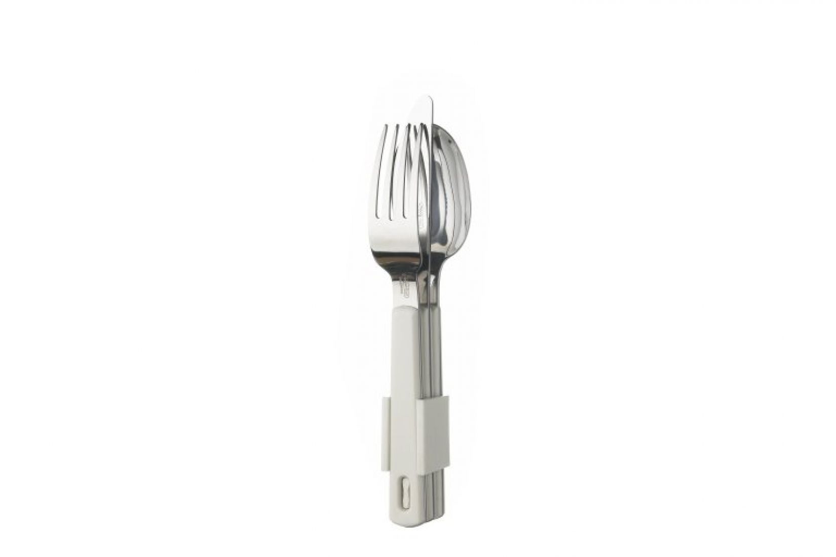 Witte bestekset van Rosti Mepal, bestaande uit een vork, mes en lepel. Een clip houdt dit driedelige kampeerbestek netjes bij elkaar. Super handig!