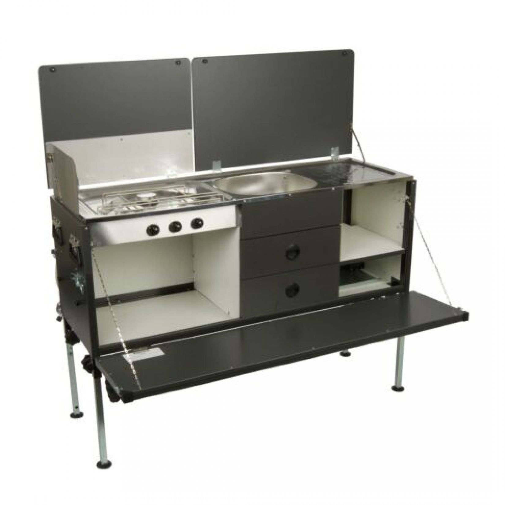 De Europa Camper Sunrider Deluxe uitvoering komt met een luxe bermkeuken (3-pits gasstel, spoelbak, twee opberglades en veel opbergmogelijkheden). De bermkeuken wordt ondersteund door vier solide poten, die in hoogte verstelbaar zijn.